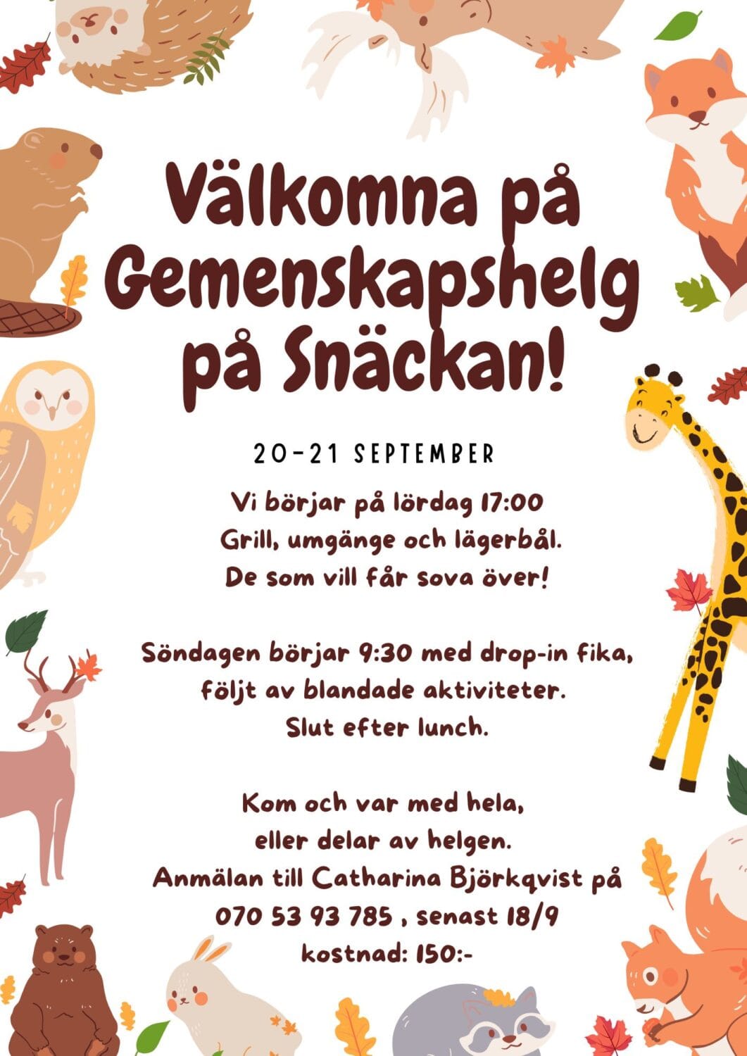 Anmäl dej till Catharina 070 5393785 eller catharina.bjorkqvist@gmail.com helst senast torsdag 18 september. Berätta om ni vill sova över, och om det finns matallergi eller liknande. Helgen kostar 150 kr för vuxna och är gratis för barnen.
