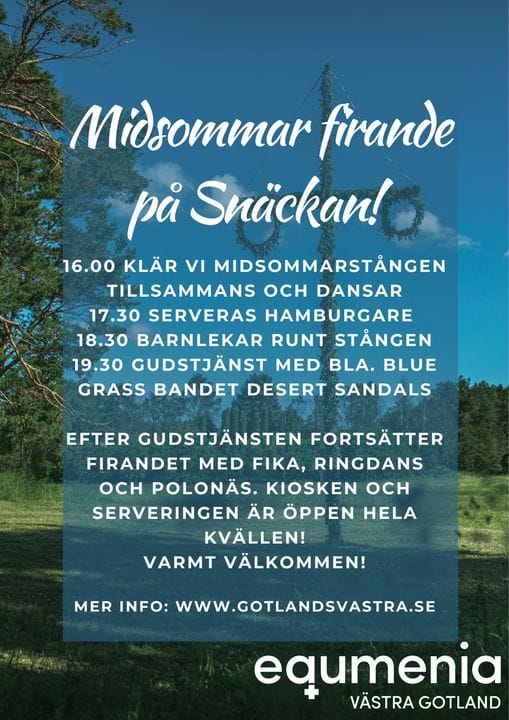 Kom och fira midsommar med oss på Snäckan! Vi börjar med att klä stången, när den är rest leker vi en stund. Ca 17:30 blir det hamburgare, och kl 19:30 gudstjänst i stora tältet med Jonas Wejde och bluegrassbandet Desert Sandals. Därefter fika, och ringlekar som avslutas med polonäs. Var med hela tiden eller den del som passar för dej! Kaffeservering och kiosk finns hela tiden utom under gudstjänsten.