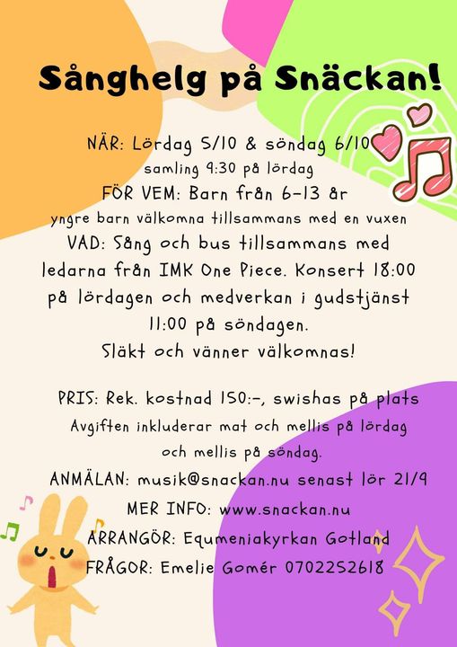 Sånghelg på Snäckan för barn 6-13 år. Yngre barn är välkomna tillsammans med en vuxen. Det blir sång och bus tillsammans med ledarna från IMK One piece, som tidigare år. Rekommenderad avgift 150 kr, swishas på plats. Mat och mellis på lördagen och mellis på söndagen ingår.